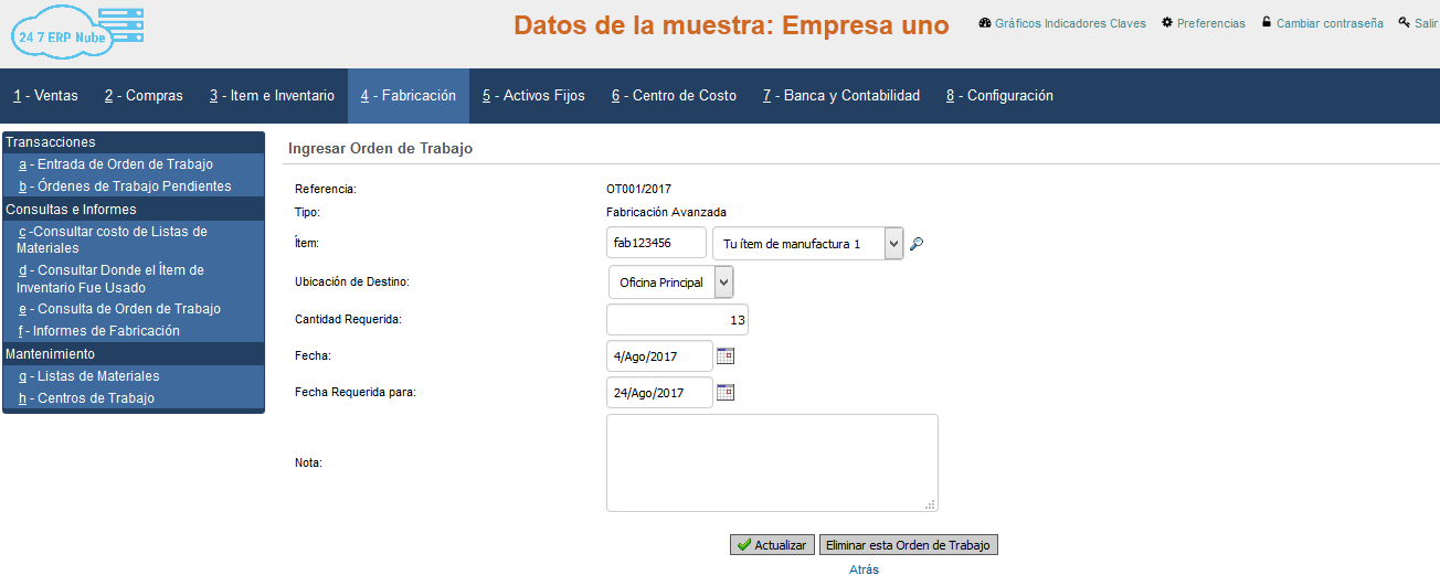 24 7 ERP Nube tiene un módulo de fabricación; aunque básico tiene algunas herramientas poderosas; incluyendo: